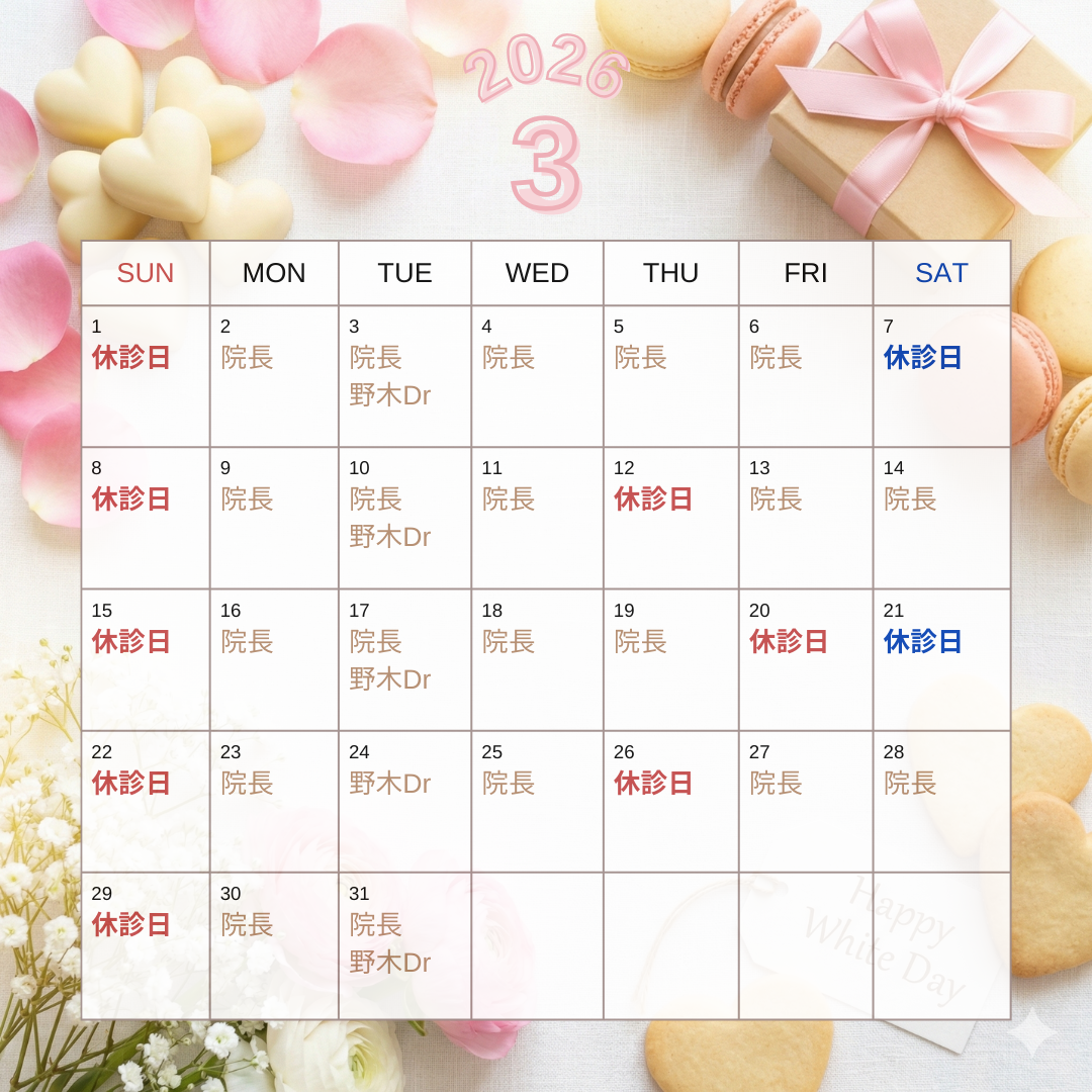 来月の3月24日(火)は院長が終日不在となり、野木医師のみとなります。