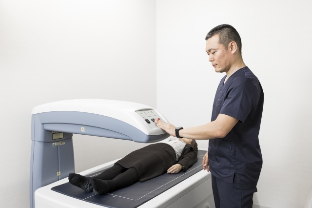 デキサ法とは、2種類のX線を使用し、骨の密度を正確に計測する方法です。この検査は、骨粗しょう症の診断や治療結果を評価する際に行われております。特に、腰椎や大腿骨の骨密度を測定し、骨折のリスクを判定することが可能です。骨量が不十分な場合は、医師が適切な薬物療法(投薬・注射)をご提案します。